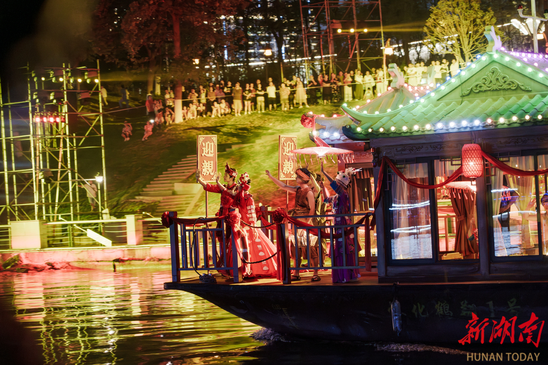 16日晚,全国首部福文化主题大型沉浸式游船演艺《福地长歌》点亮怀化夜色:游船缓缓行,少数民族阿哥阿妹演绎“展卷人”,带领宾客寻福五溪,感悟屈子行吟叩问天地的“福源”、通道转兵绝境逢生的“福运”、芷江受降挺立民族脊梁的“福佑”、杂交水稻哺育人类的“福梦”、“义利相济”的“洪福洪商”以及国际陆港的“福满五溪、商通天下”。