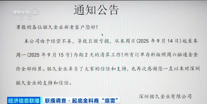 记者了解到,目前已有多家黄金原料供应商在网上发公告,称公司由于经营不善,导致巨额亏损,正在进行清算工作,所有订单存料按照9月13日融通金金价全部结算。随后记者也来到一家发布公告的黄金原料供应商了解情况,该负责人表示,公司资金链确实已经断裂,无法履行与下游商家的合同,目前已经在变卖个人资产去还债。