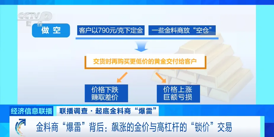 以做空交易为例,客户以790元/克的价格锁价下定金,一些金料商预计金价会下跌,不实时购入对应价格的黄金交货,而是放“空仓”,等交货时再购买更低价的黄金交付给客户。如价格按预期下跌,金料商可以获得其中差价盈利。然而,近期,国际金价屡创新高,远超他们收取预付款时的价格,巨大的缺口使其根本无法交付实物。