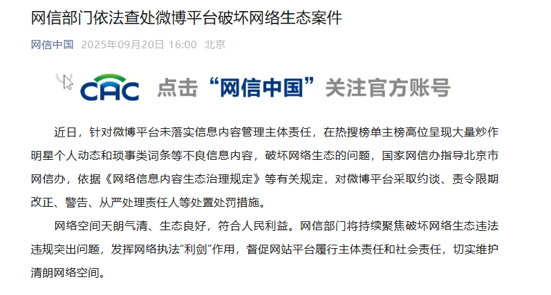 网信部门依法查处微博平台破坏网络生态案件