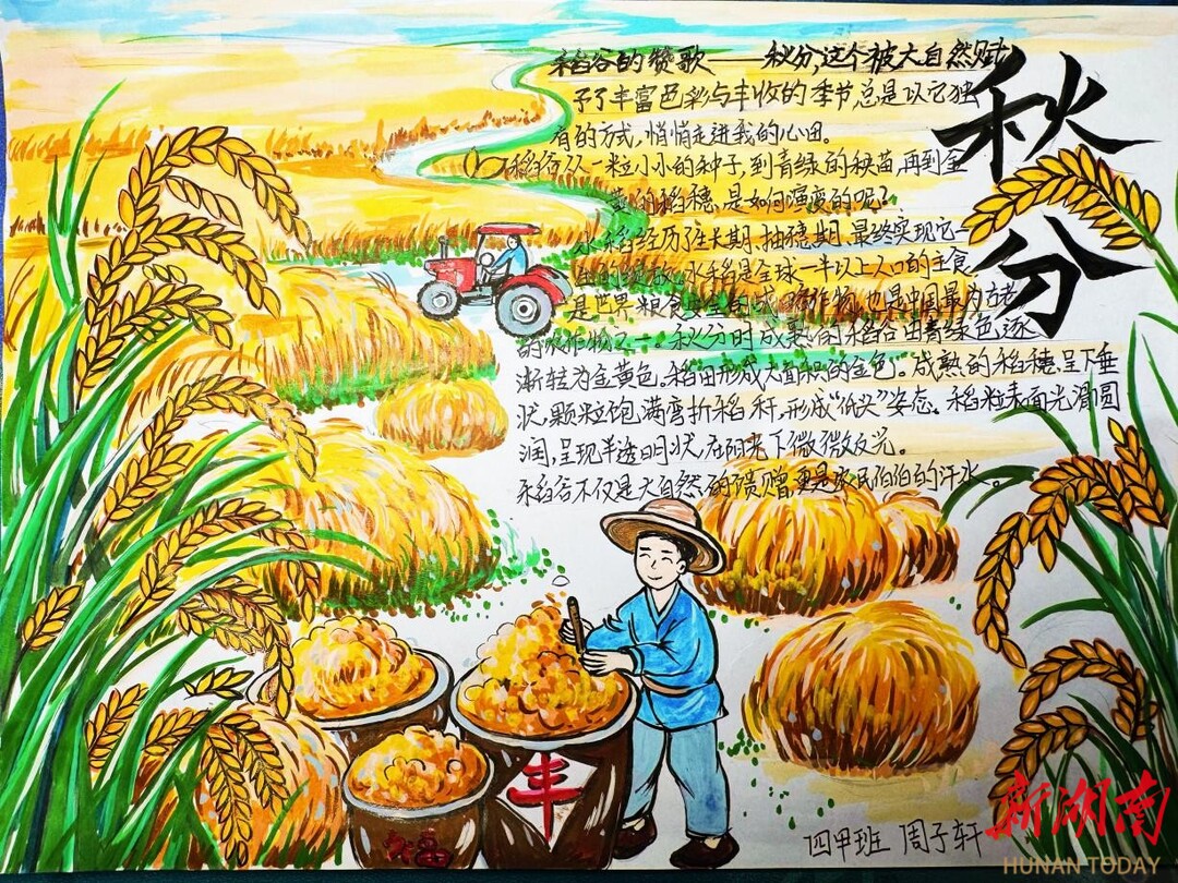 傍晚,夕阳把天空染成了红色和橙色,稻田也跟着变成了金色,美得像在梦里。秋分——稻谷的赞歌,稻谷不仅是大自然的馈赠,更是农民伯伯的汗水。它教会我们珍惜每一份劳动成果,让我们懂得了“一分耕耘,一分收获”的道理。