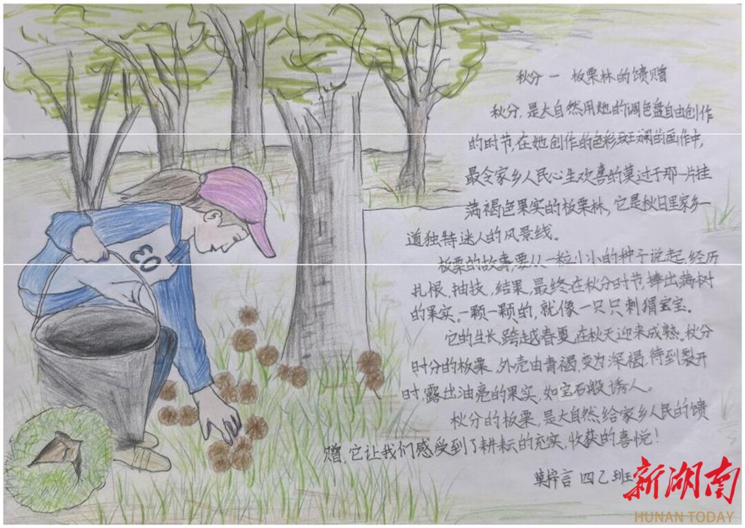 秋分的岳麓山裹着丝丝微凉,我和小伙伴们相约去山里“寻宝”。山坳里的几棵板栗树坠着青褐的“小刺猬”。我们蹦跳着走近,却就见一个圆滚滚的板栗壳“啪”地落在脚边,我们吓得钻进着妈妈的怀抱,又好奇地往地上瞅。