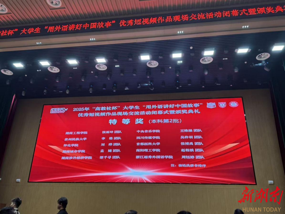9月19日至21日,2025年大学生“用外语讲好中国故事”优秀短视频大赛在江汉大学举行。本届大赛以“新时代・新变化——时潮奔涌,青春不凡”为核心主题,全国1093所高校提交了6915件作品,经过8个月的校级、省级环节的层层遴选,最终怀化学院作品《和平守望者》在现场决赛中荣获本科组特等奖。