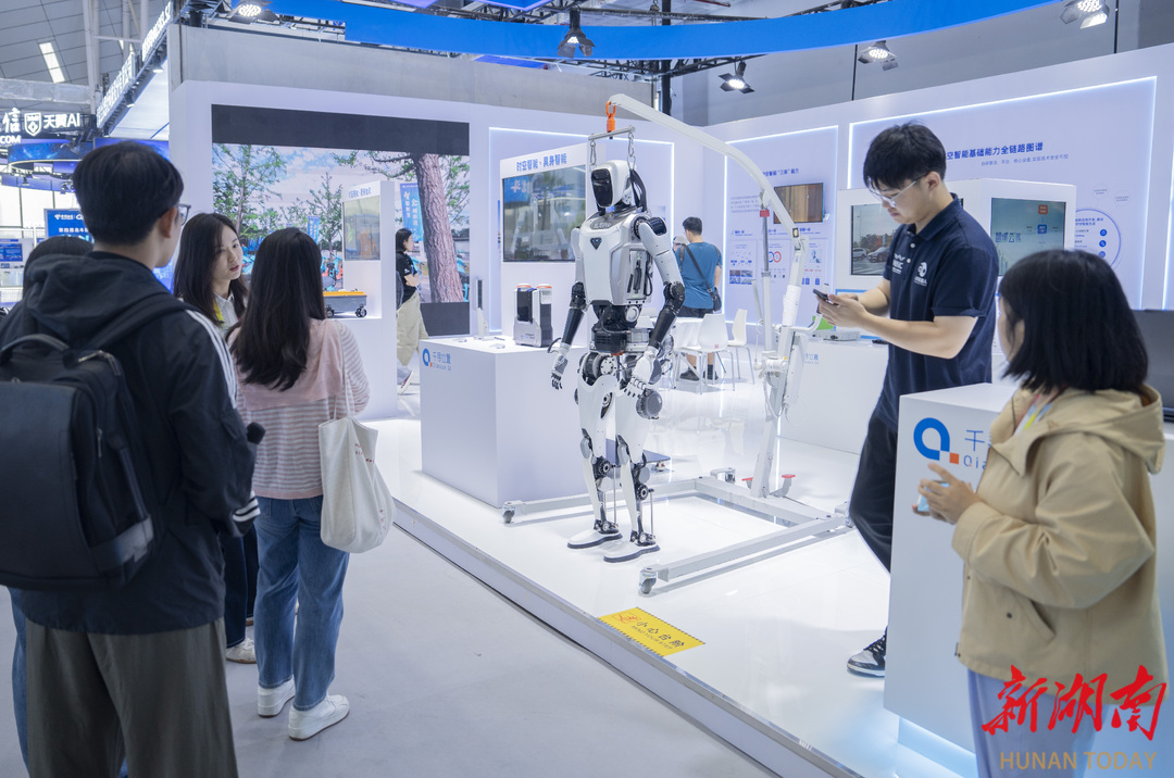 千寻位置网络有限公司展位前,“青龙”人形机器人引人关注。湖南日报全媒体记者 李健 摄