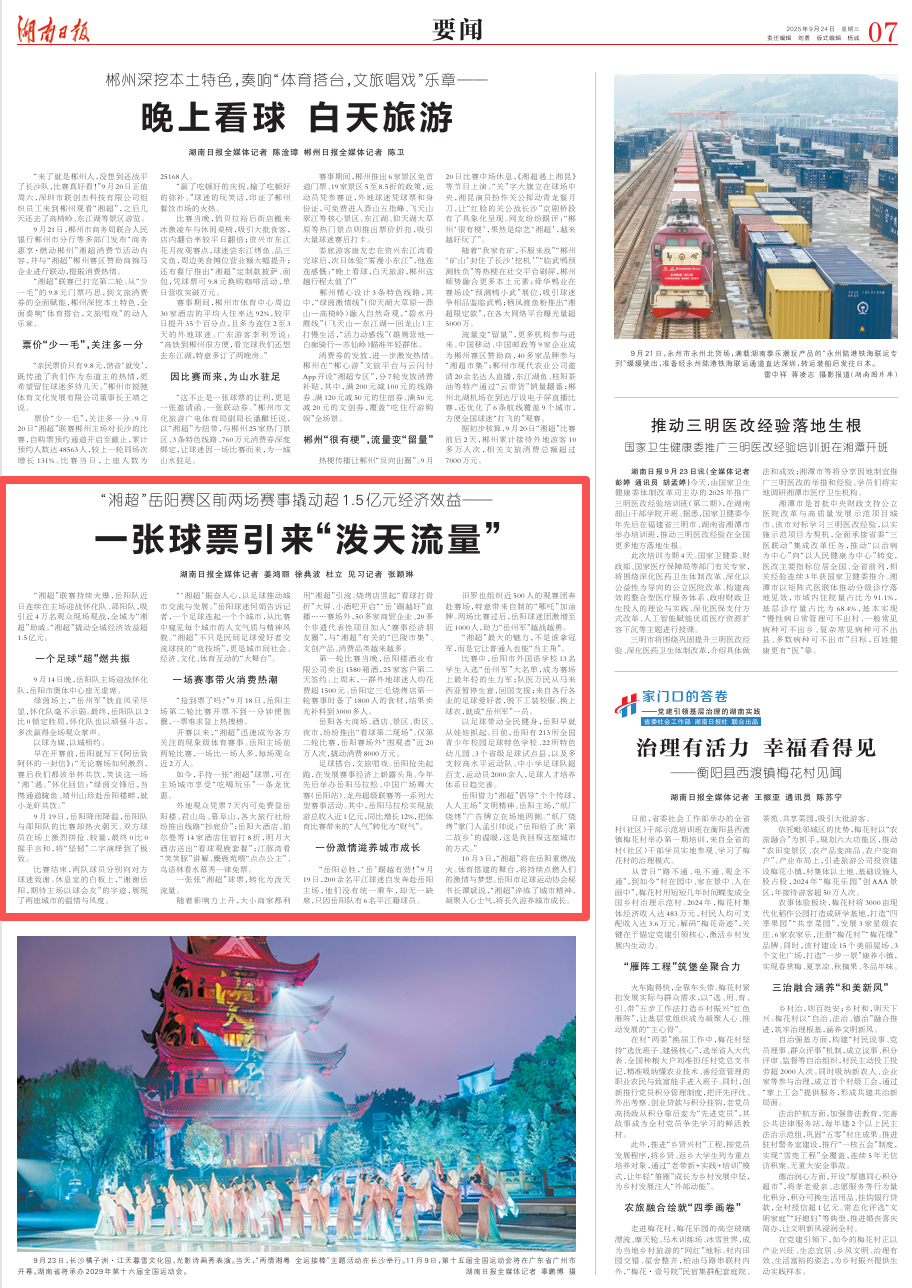 “湘超”联赛持续火爆,岳阳队近日连续在主场迎战怀化队、邵阳队,吸引近4万名观众现场观战,全城为“湘超”助威。“湘超”撬动全城经济效益超1.5亿元。