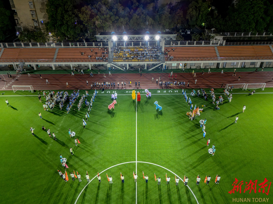 仪式在《龙狮欢腾,旗开得胜,逐梦未来》的开场表演中拉开帷幕。17面院旗组成的彩旗队率先入场,旗帜交错如流动彩虹,彰显各学院特色;高杆金龙盘旋腾跃,以力与美的交融诠释勇攀高峰的体育精神;6头融合电光与传统元素的祥狮随着锣鼓声欢腾跳跃,寄托吉祥如意的美好祝愿;12名足球小将推动巨型充气足球登场,通过“梦想传递”仪式向嘉宾致意,展现团结拼搏的体育内涵。