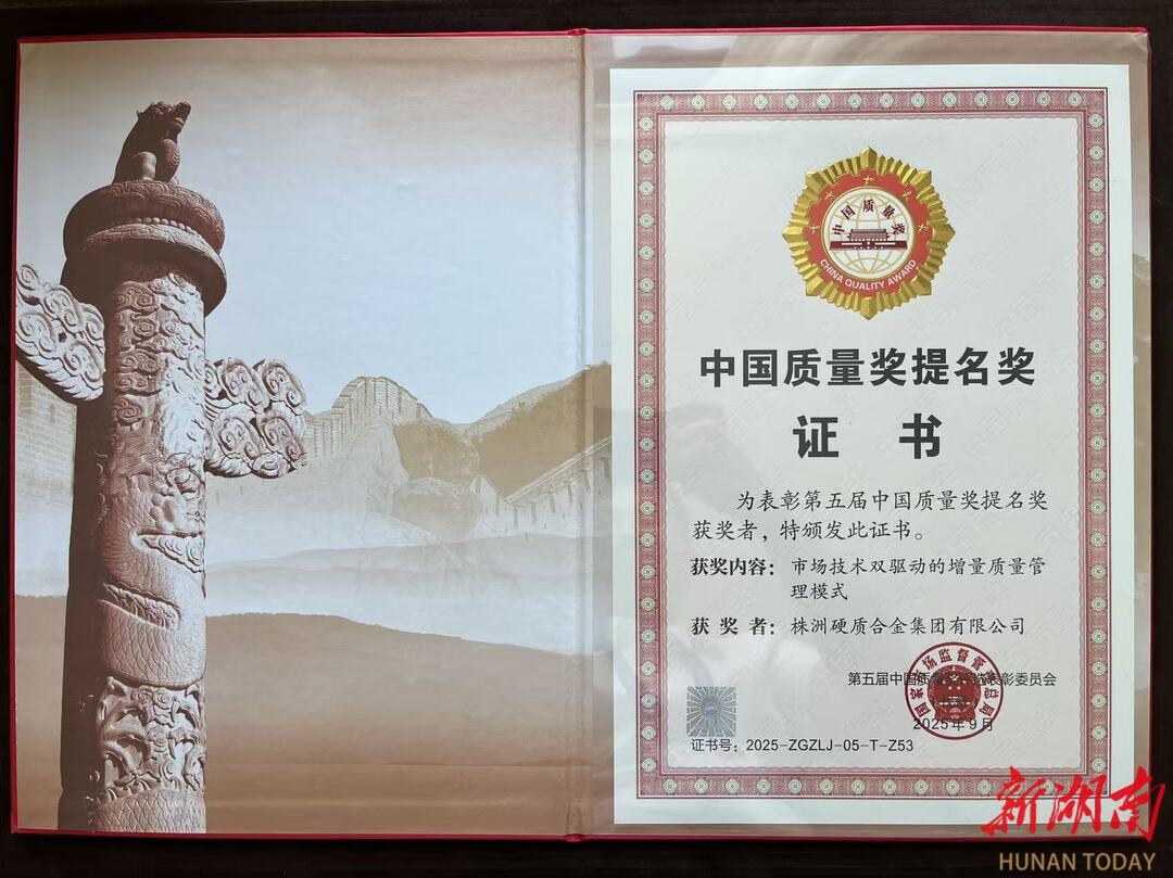 9月16日,在南京召开的中国质量大会上,株洲硬质合金集团有限公司荣获第五届中国质量奖提名奖,成为行业唯一获奖单位。这是株硬集团继2022年荣获“湖南省省长质量奖”后,在质量领域取得的又一项殊荣。