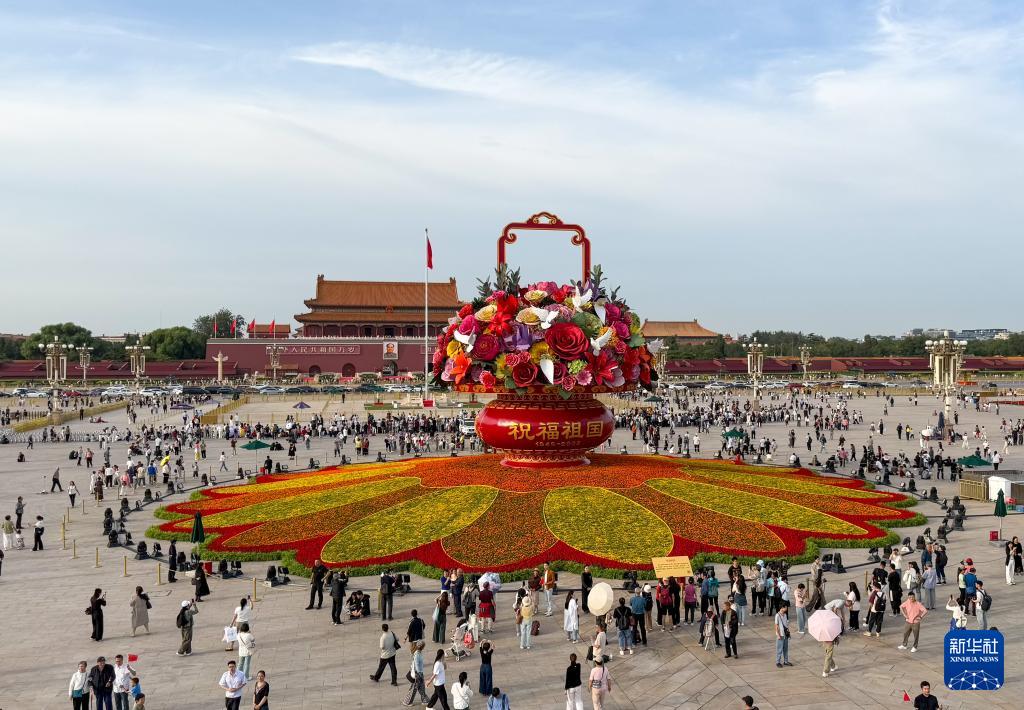 9月25日,2025年“祝福祖国”巨型花篮正式完工,亮相天安门广场与市民共度佳节。今年“祝福祖国”花坛以喜庆的花篮为主景,花坛顶高18米,篮体高16米,篮盘直径12米。篮体南侧书写“祝福祖国”“1949-2025”字样,篮体北侧书写“欢度国庆”“1949-2025”字样。篮内选取了美好寓意的花卉,其中荷花寓意“和和美美”、橄榄枝寓意“荣耀和平”等,还结合和平鸽元素,体现“和平发展、欣欣向荣”