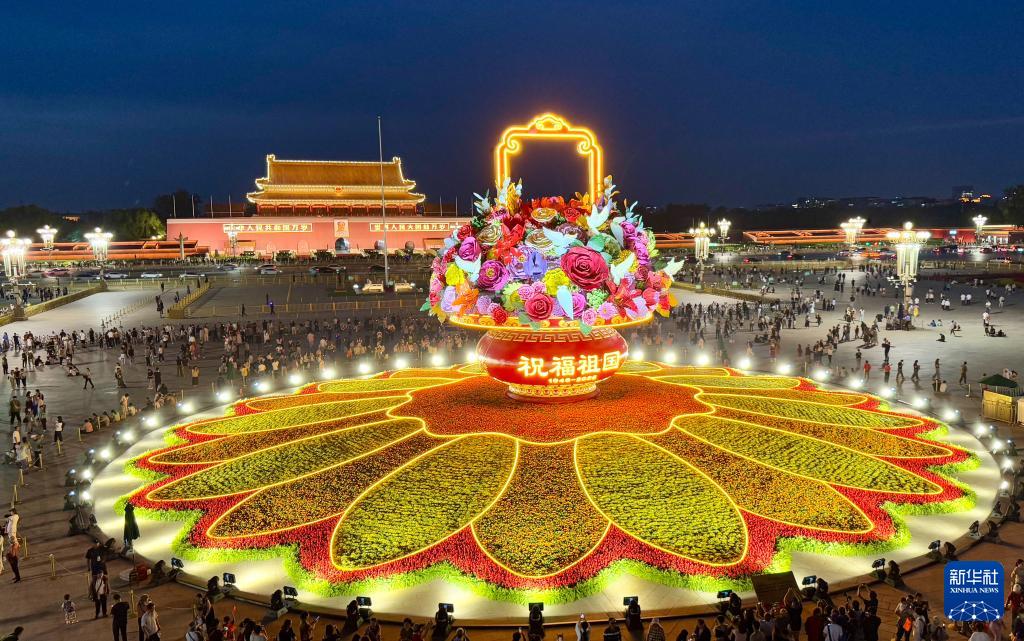 9月25日在天安门广场拍摄的“祝福祖国”大花篮。新华社记者 鞠焕宗 摄
