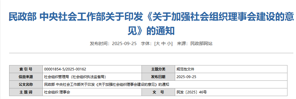 为进一步推动社会组织规范化建设,根据相关法律法规和政策规定,民政部、中央社会工作部制定了《关于加强社会组织理事会建设的意见》(以下简称《意见》)。请结合工作实际,认真抓好贯彻落实。