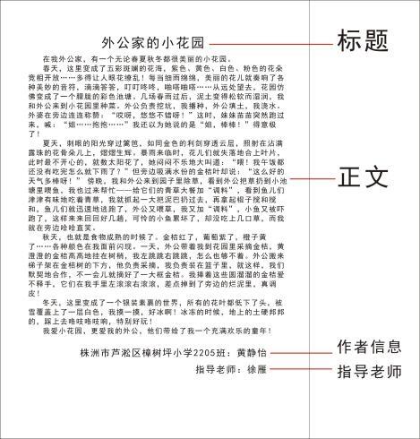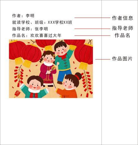 需注明作者姓名、就读学校、班级、指导老师姓名、作品名。具体格式如下图: