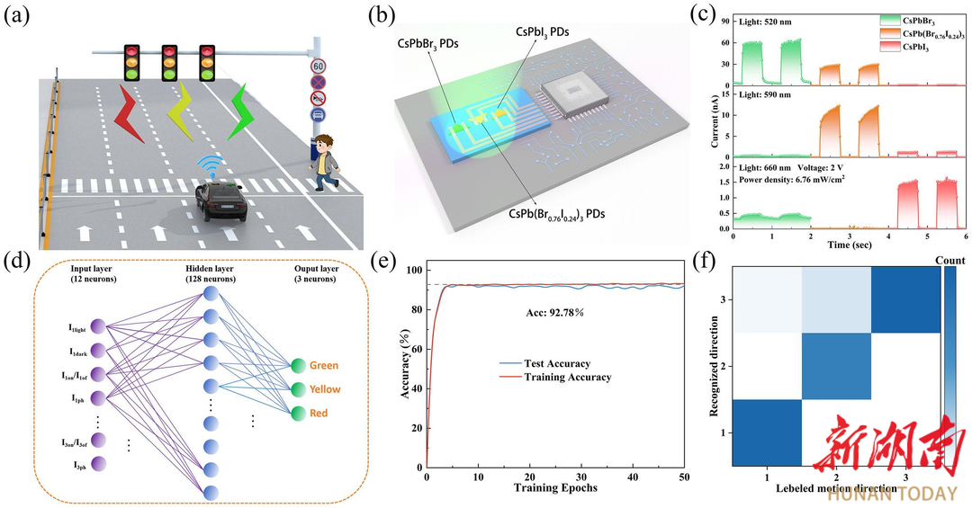 钙钛矿材料作为近年来光电领域的“明星材料”,在太阳能电池、发光二极管和光电探测器等方面展现出巨大潜力。此次研究中,团队利用该材料垂直立式生长以及组分调控能实现绿色到红色发光的新颖特点,解决了传统多色探测技术依赖复杂滤光片阵列或堆叠结构导致的器件体积大、成本高且集成困难等问题。其合成的CsPb(Br₁₋ₓIₓ)₃三角形纳米片横向尺寸可达几十微米,光致发光可调范围从绿色(530 nm,2.34 eV)到红色(709 nm,1.75 eV)。基于该材料的光电探测器在特定波长(520、590和660 nm)下表现出高性能探测和图像传输能力,且通过与神经网络算法集成开发的交通灯识别系统,识别准确率达92.78%。