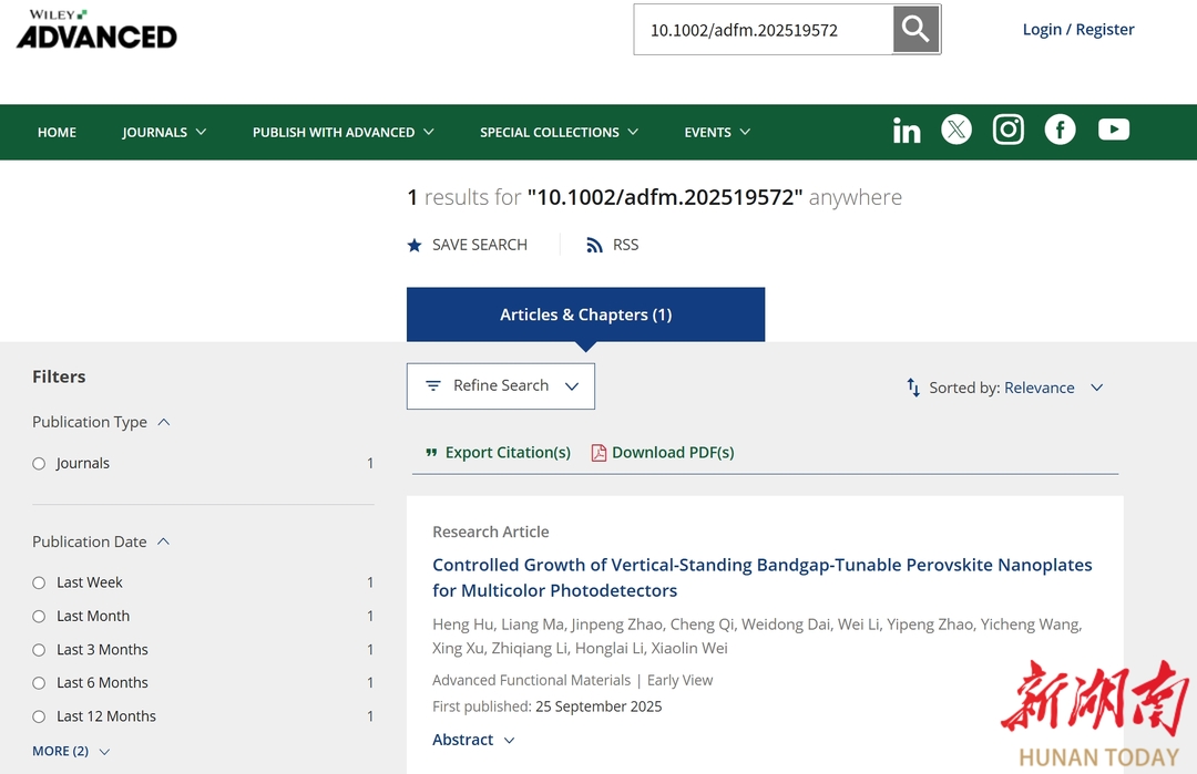 9月25日,衡阳师范学院物理与电子工程学院电子信息专业2023级硕士研究生胡衡以第一作者身份,在国际材料科学顶级期刊《Advanced Functional Materials》(JCR/中科院:Q1 IF:19.0)上发表研究论文“Controlled Growth of Vertical-Standing Bandgap-Tunable Perovskite Nanoplates for Multicolor Photodetectors”(DOI: 10.1002/adfm.202519572)。