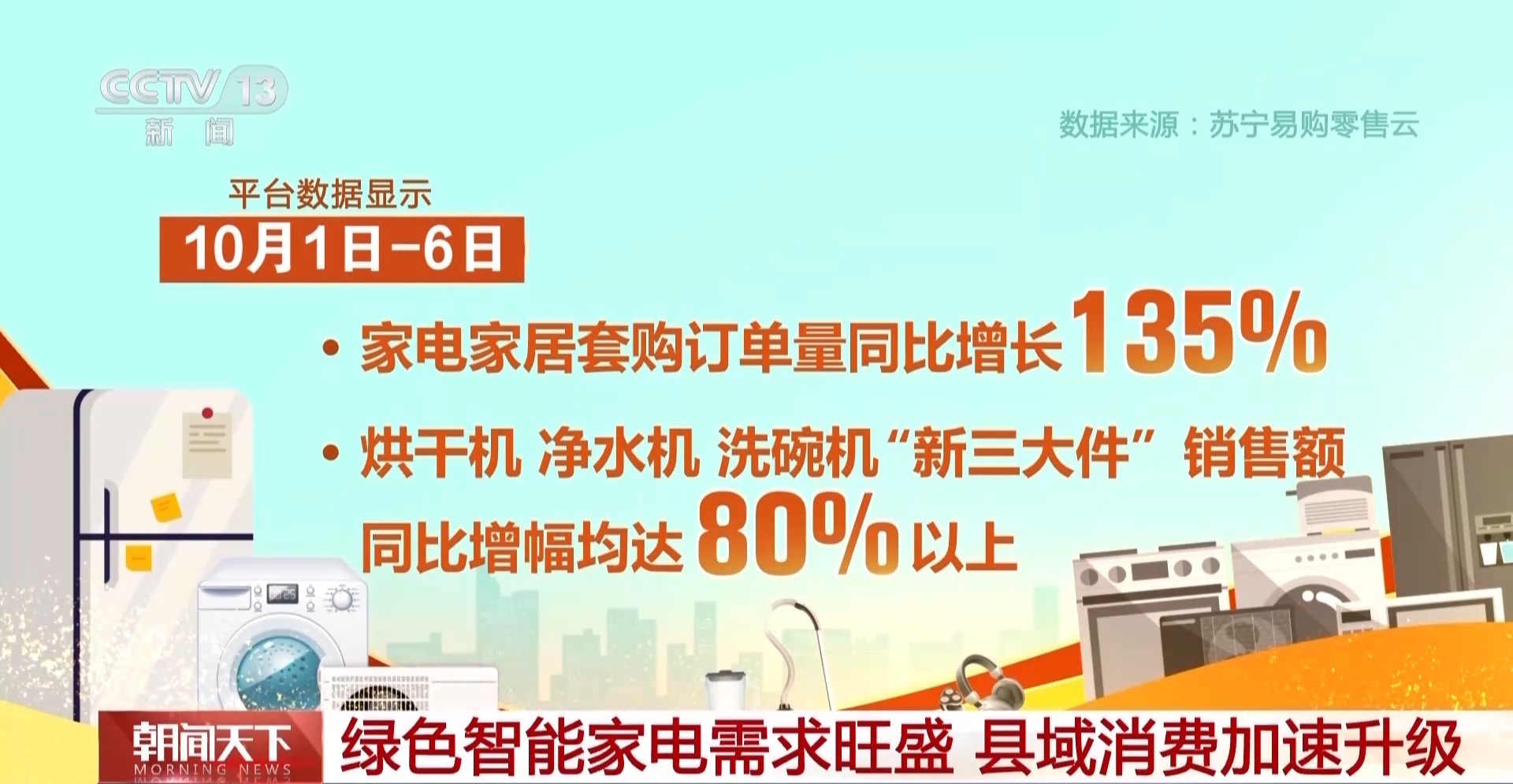 平台数据显示,10月1日到6日,县域家电销售额同比增长55%,万元以上家电销售额同比增长75%,家电家居套购订单量同比增长135%。
