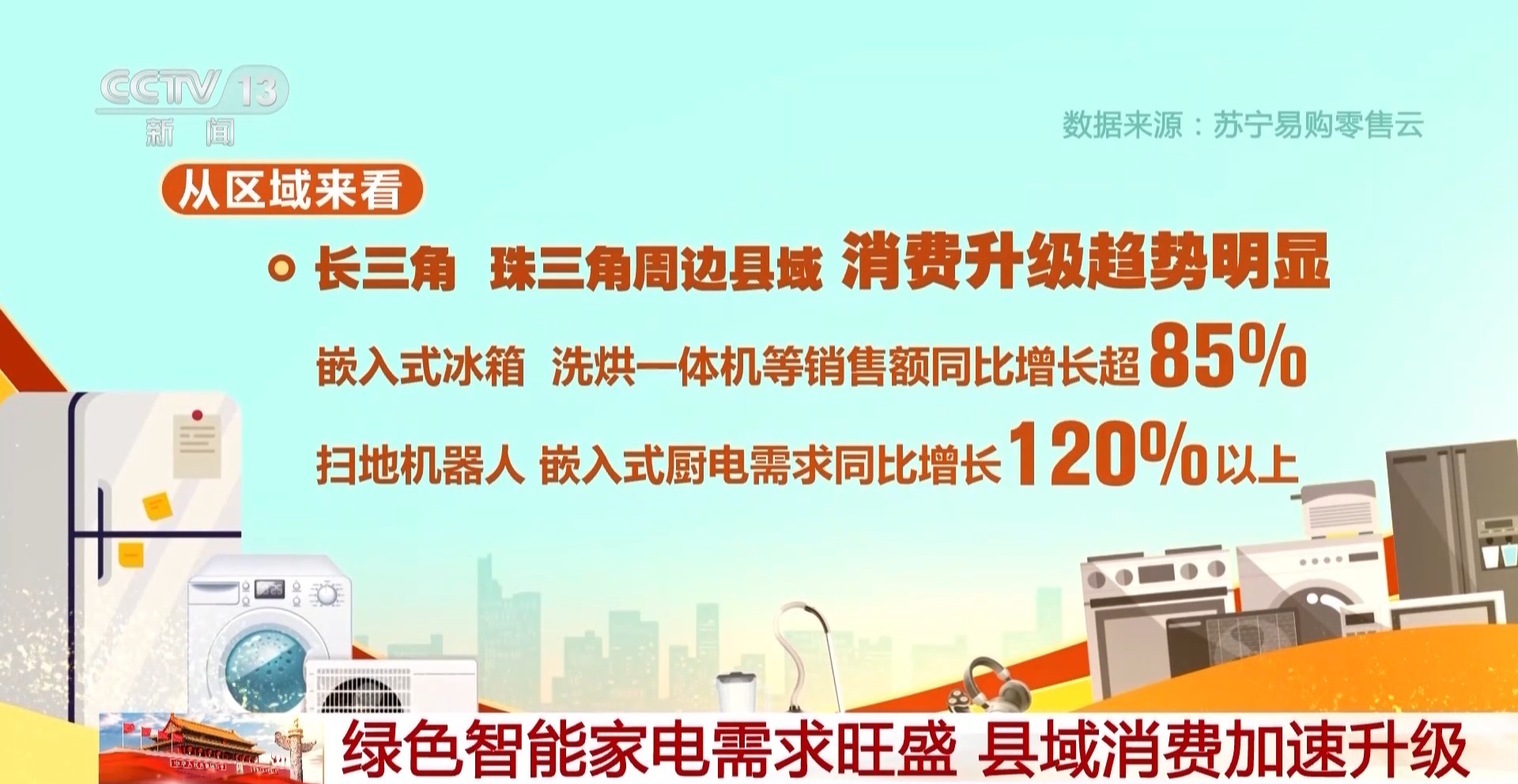 从区域来看,长三角、珠三角周边县域,消费升级趋势明显,嵌入式冰箱、洗烘一体机等销售额同比增长超85%,扫地机器人、嵌入式厨电需求同比增长120%以上;北部及中西部人口大县高端智能产品渗透率逐步提升。
