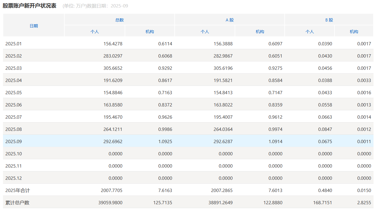 而从月度数据来看,2025年1月至8月,A股新开户总数分别为157万户、283.59万户、306.55万户、192.44万户、155.56万户、164.64万户、196.36万户、265.03万户。9月293.72万户的新开户数,仅次于3月的306.55万户。