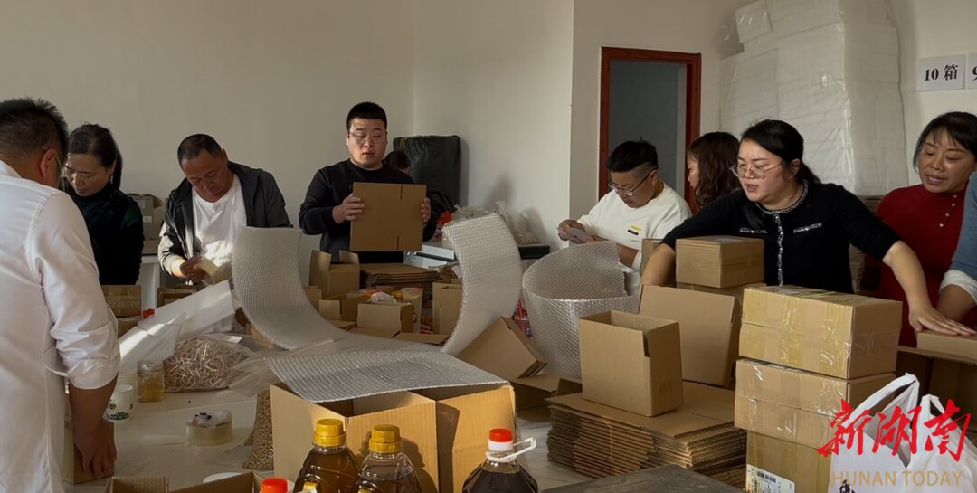 如今的筻口镇,空坪隙地不再闲置,村民扛着锄头把荒地垦成菜园,辣椒、紫苏、金银花挨挨挤挤长了满坡。田间地头是忙着采摘的农户,直播间里是吆喝叫卖的干部,打包点里堆成小山的包裹正贴着“岳阳筻有味”的标签发往全国。