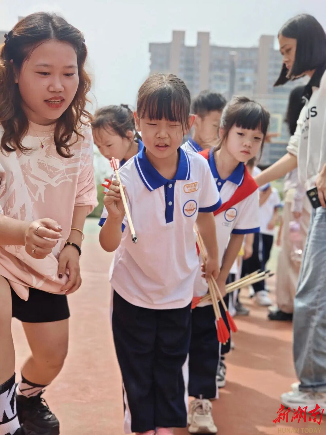 明德望城学校的“传统趣味”项目,则用简单快乐点燃全场热情:箭矢轻抛入壶,欢呼声瞬间炸开;麻袋套腿蹦跳,笑声里满是童真;两人背靠背传递气排球,默契在汗水中慢慢生长;钻“花丛”隧道、爬“蜂巢”网洞的“采蜜”接力,更让孩子们在模仿小蜜蜂的过程中,体会“勤劳”的意义。这些没有复杂规则的项目,让每个孩子都能轻松参与,在奔跑与协作中享受运动最本真的快乐。