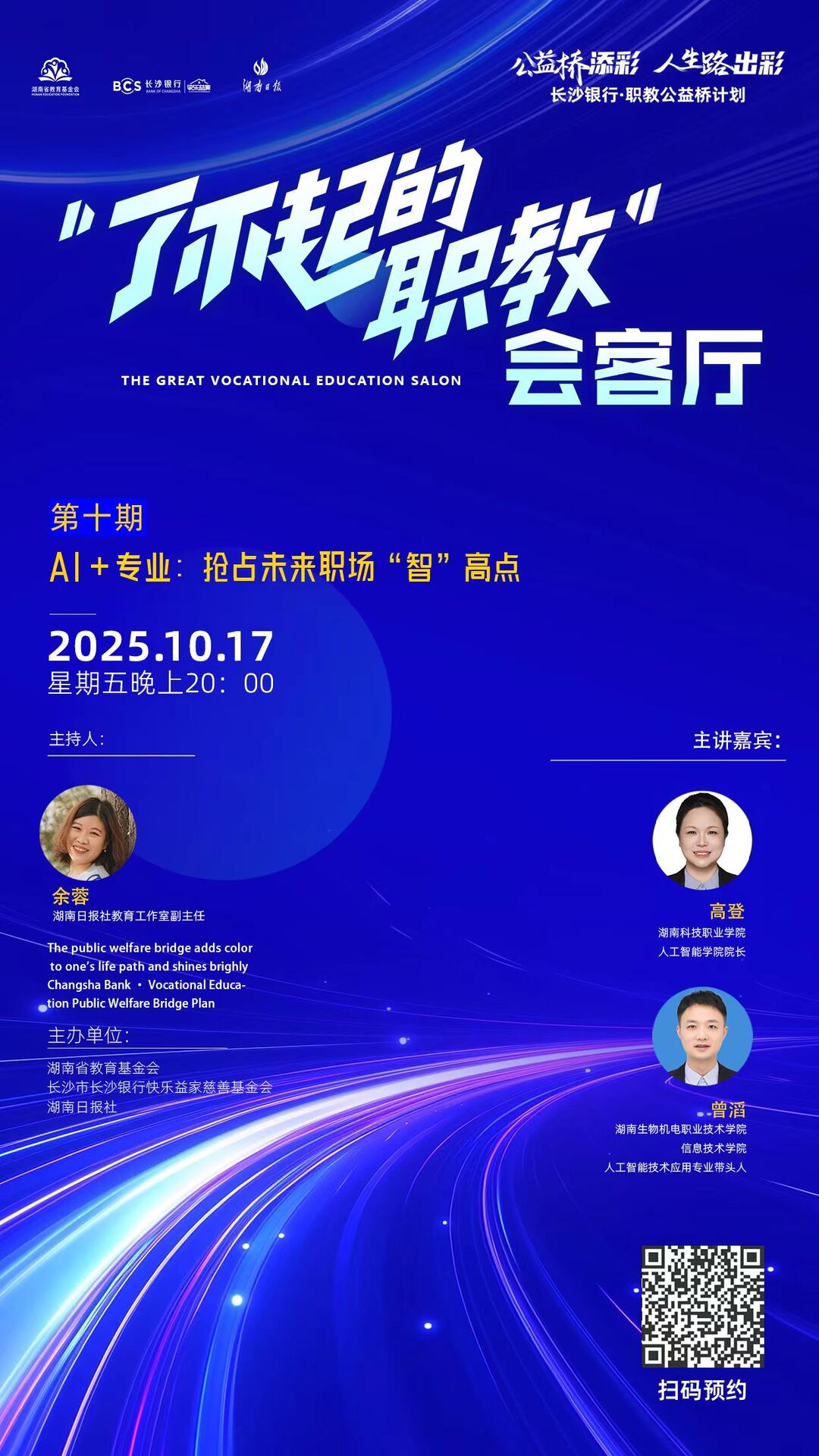 10月17日(本周五)晚8点,由长沙市长沙银行快乐益家慈善基金会、湖南省教育基金会、湖南日报社联合发起的“长沙银行・职教公益桥计划”之《“了不起的职教”会客厅》第十期节目,将在新湖南客户端・湘学频道上线。本期节目聚焦人工智能技术应用专业,深入拆解职业教育在AI领域“接地气、强适配、快落地”的独特优势。
