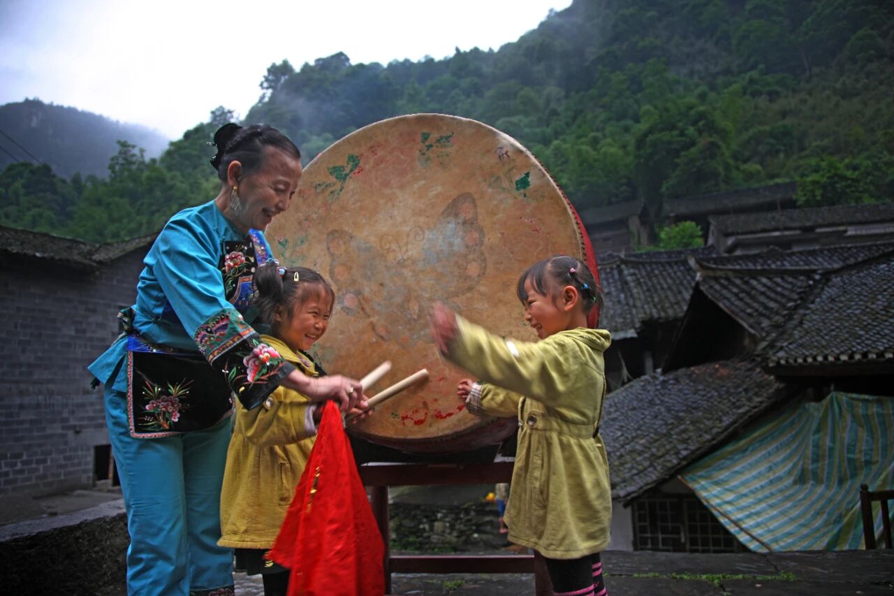 湘西苗鼓传承(苗族鼓舞国家级传承人石顺明教小女孩打苗鼓,龙颂江摄于吉首)