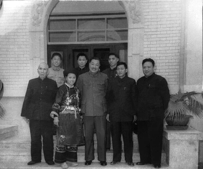 1950年代中期,国家在贵阳召开苗文会议,贺龙元帅接见参加会议的苗族、土家族代表(中为贺龙,左一为湖南省民委主任龙辑五,左四为湘西州副州长彭祖贵,左二为花垣标准苗语点群众,后左一为石邦本)(陈廷茂《湘西百年影像实录》)