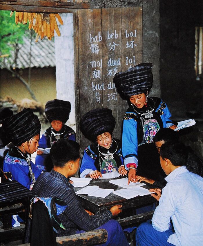 1980年代,湘西苗族青年在学习新编苗文课本(陈廷茂《湘西百年影像实录》)