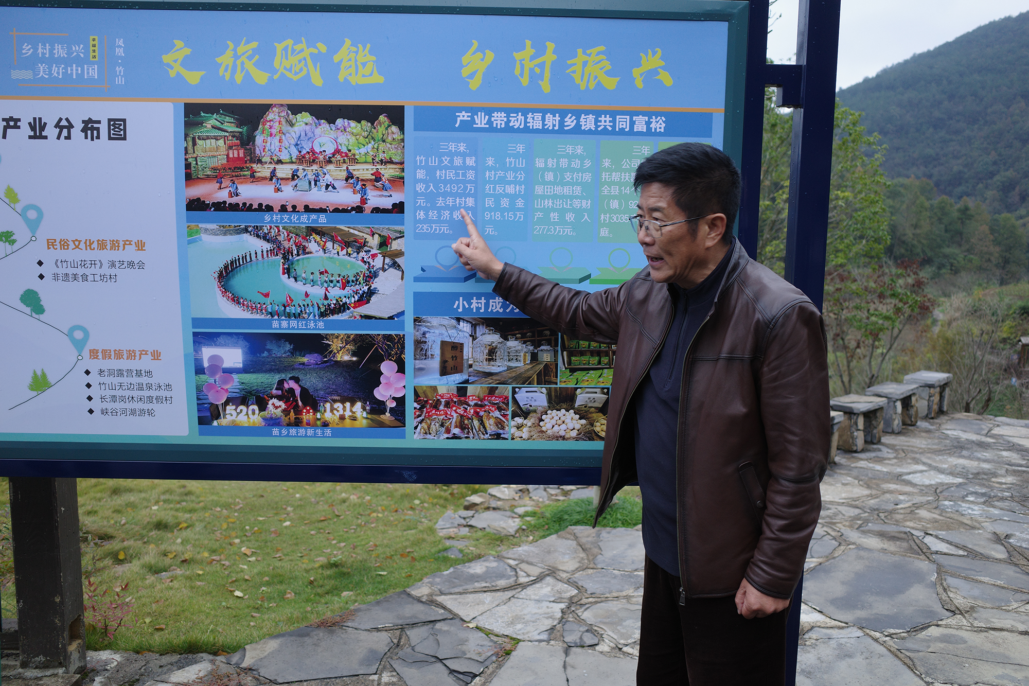 凤凰县麻冲乡竹山村,凤凰旅投董事长张顺心在介绍竹山旅游模式,2022年,竹山村接待游客25万人次,实现旅游收入2518万元,创造了267个就业岗位,村集体经济收入达到235万元,村民人均纯收入从2013年1820元增加到2022年19800元