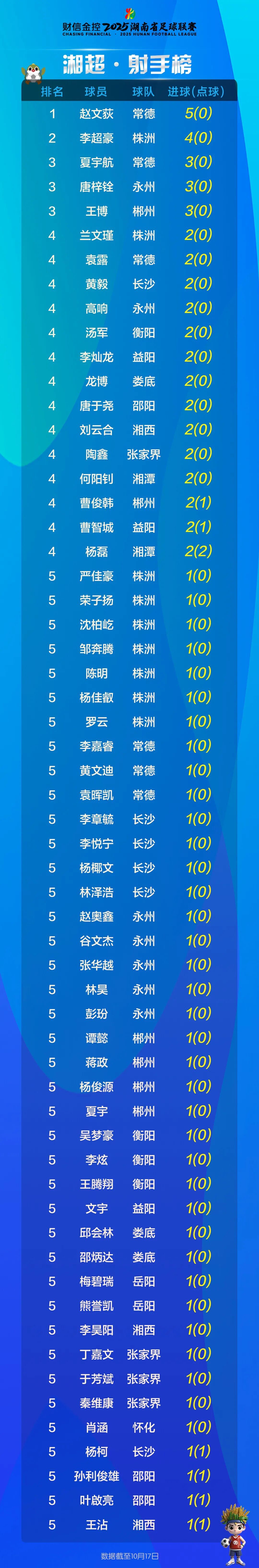 湘超射手榜(截至10月17日)