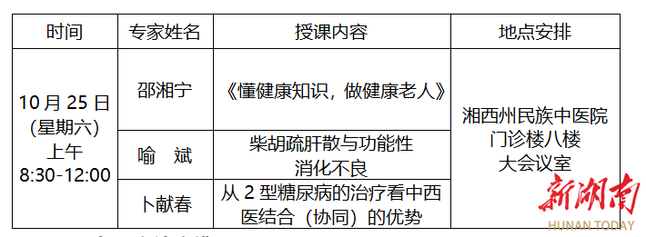 新湖南客户端10月18日讯(记者 郭朵朵)由湖南省中医药和中西医结合学会、湖南省老年保健协会组织安排的一批省级知名专家,将于10月25日来湘西土家族苗族自治州民族中医院开展义诊和讲座等活动,让湘西州群众在家门口享受省级医疗专家的优质服务。
