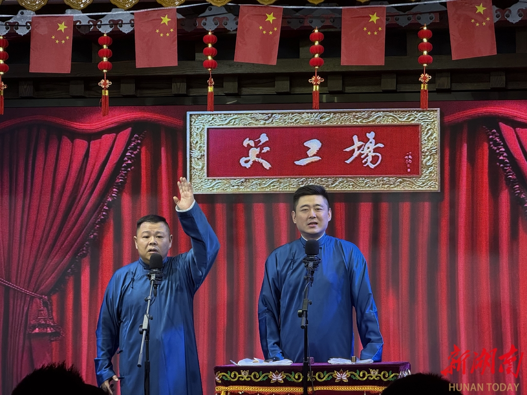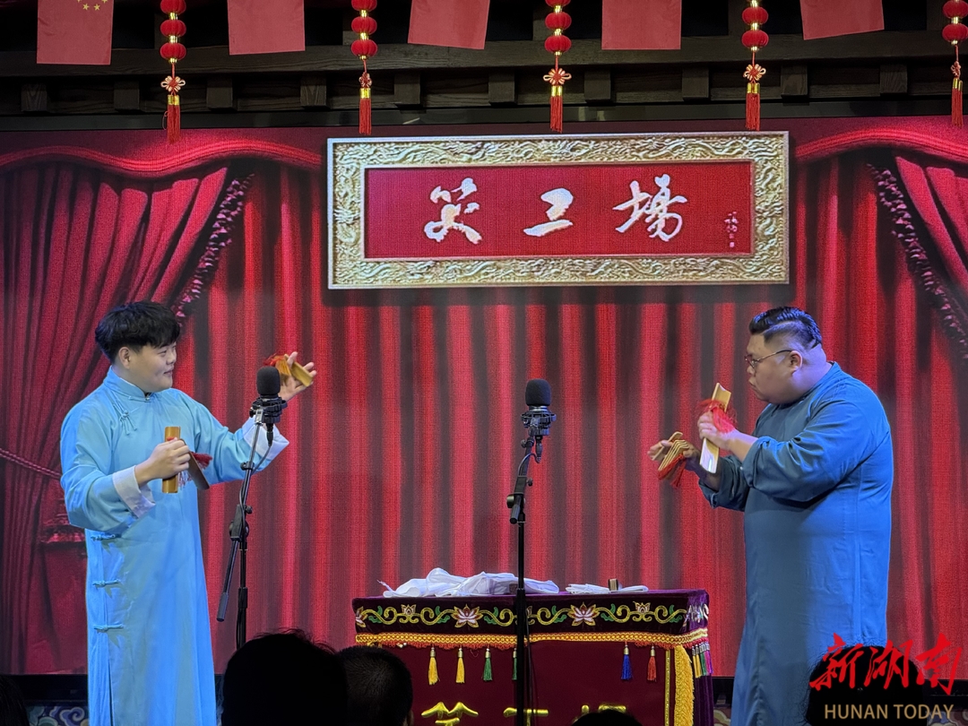 夜幕下的天心阁古朴静谧,而其墙根处的笑工场剧场内,是另一番热火朝天的景象。著名相声演员大兵、笑星熊壮、童鸣等人轮番登场,打造了一场独具“湘”味的相声表演。