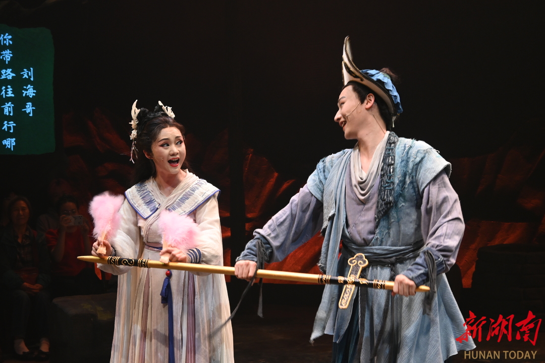 省花鼓戏剧院座无虚席,《新刘海砍樵》用传统韵味与创新表达,为现场观众带来了一场沉浸式的文化盛宴。随着绚丽灯光点亮舞台,一段精美的刺绣元素表演拉开了演出序幕,水墨般的灯光效果瞬间将观众带入花鼓戏的独特意境中。