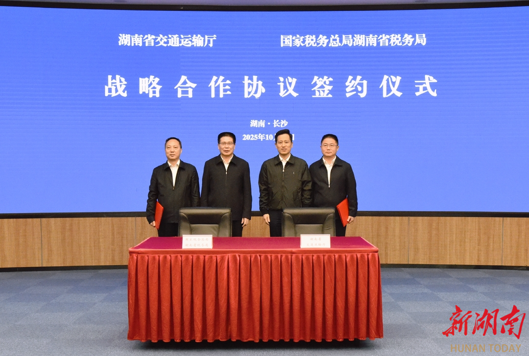10月21日,国家税务总局湖南省税务局和湖南省交通运输厅签署《推动财源建设加快谱写交通强国湖南篇章战略合作协议》,通过数据共享共用、税费精诚共治,合力推进交通运输领域的财源建设,助力湖南加快实现“三高四新”美好蓝图。湖南省税务局党委书记、局长曾光辉,省交通运输厅党组书记、厅长刘扬出席签约仪式。湖南省税务局党委委员、副局长曾初良,省交通运输厅党组成员、副厅长吴广君签署协议。