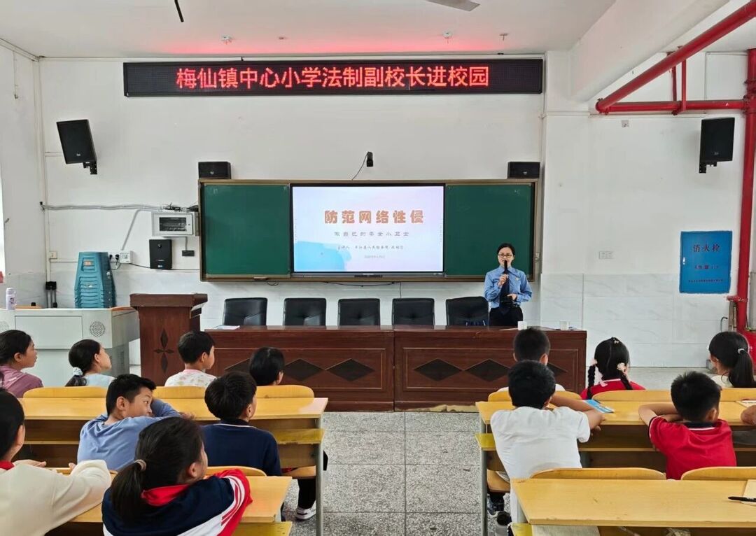 梅仙镇中心小学:第四检察部主任陈均匀以“防范网络性侵”为主题,从“什么是隔空猥亵”切入,还原网络风险场景。通过互动抢答,将“不点击不明链接、不随意添加陌生好友、绝不外传隐私照片”的安全守则深深烙印在学生心中。