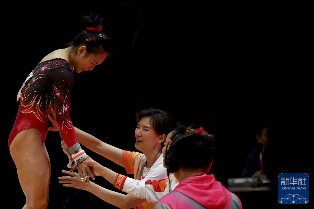↑中国选手张清颖在女子资格赛高低杠项目比赛后与教练互动。新华社发(阿贡·昆卡亚摄)