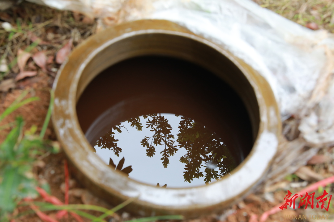 基础发酵完成后,进入最关键的“套缸陈酿”环节。吴亚陆将发酵好的杨梅酒与靖州米酒按特定比例注入陶缸,让两种酒液自然交融,单一果香慢慢转化为层次丰富的复合香气,酒体也愈发醇厚绵柔。“必须用我们本地的靖州米酒来‘搭骨架’,这是风味的关键。”他强调。