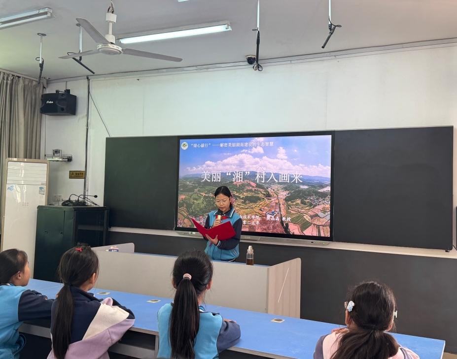 不同于城市学校的科普场景,砖桥小学的孩子们成长于田野间,对乡村有着天然的亲近感。来自长沙环境保护职业技术学院的讲座专家樊晶晶,采用了更加贴近乡土、贴近生活的授课方式:以“咱们砖桥村的稻田、果园,为什么一年比一年美?”这一孩子们熟悉的场景开篇,瞬间点燃思考热情。随后从“国家要守住乡村这抹绿”讲到“咱们家门口的好环境能让日子更舒心”,用“村里的柚子园丰收卖好价”“家门口的小河变清能钓鱼”等鲜活案例,让“美丽乡村建设”不再是遥远的口号,而是与生活息息相关的幸福密码。