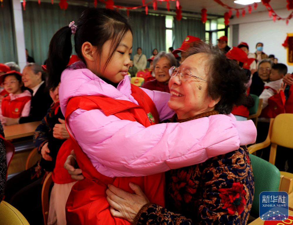 ↑ 10月25日,在河南省南阳市中健天佑独山基地养老院,南阳市小雷锋志愿者协会的志愿者与老人进行“抱一抱 更温暖”互动活动。新华社发(高嵩摄)