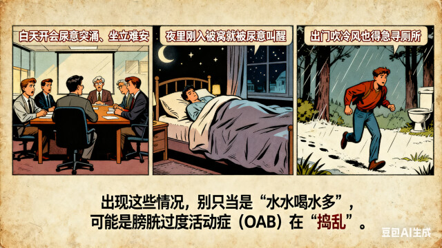秋凉渐浓,不少人被尿频尿急困扰:白天开会尿意突涌、坐立难安;夜里刚入被窝就被尿意叫醒;出门吹冷风也得急寻厕所。