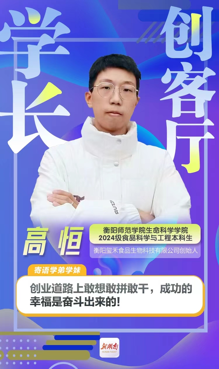 高恒,衡阳师范学院生命科学学院2024级食品科学与工程本科生,衡阳玺禾食品生物科技有限公司创始人。科创赛场屡创佳绩,与团队先后斩获生命科学竞赛国赛二、三等奖,省赛一、二、三等奖,以及湖南省留学归国人员创新创业大赛三等奖等多项荣誉。他深耕食品科技创业领域,带领企业布局食品生产销售、酒类经营、技术服务与推广、农业科学研究及食用农产品批发等多元业务,将课堂所学与市场需求深度融合,在产学研用的道路上稳步前行,彰显青年创客的实干精神与开拓视野。