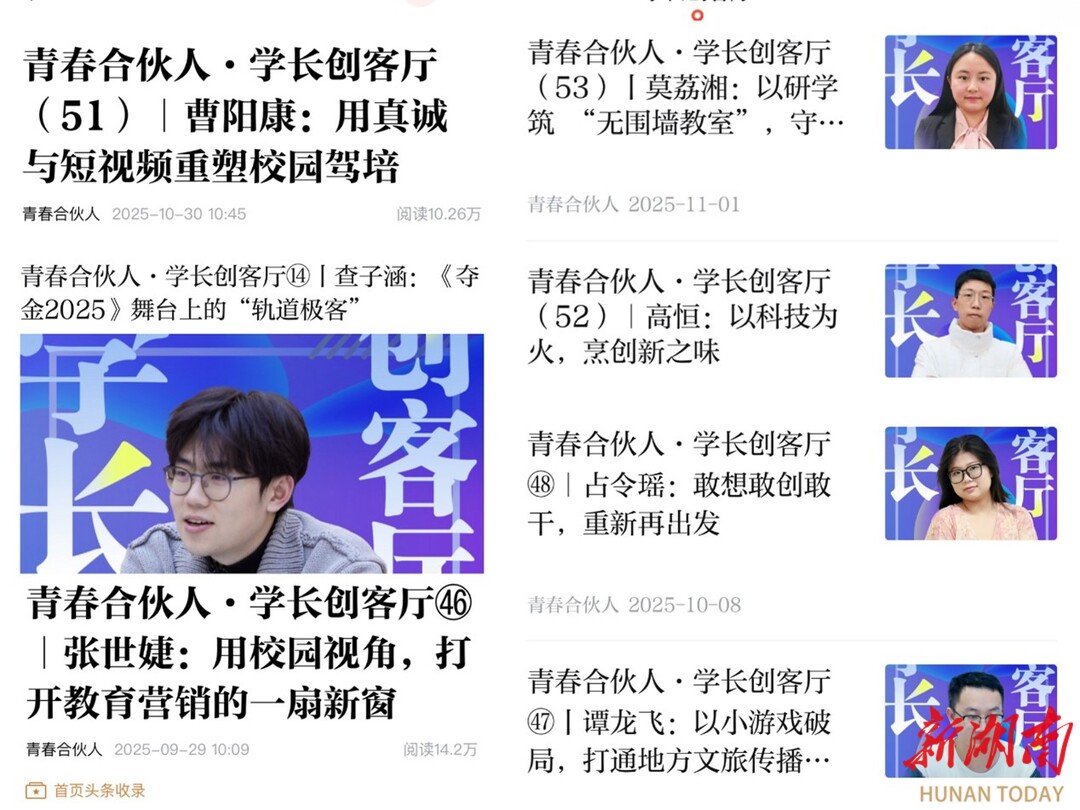“青春合伙人”是湖南日报新湖南客户端打造的创新平台,它打破传统实习的“旁观者”模式,赋予高校学子平等的“合伙人”身份,通过理念创新、产教融合与价值引领,构建人才培养新生态。平台鼓励青年自主组队、竞标选题、主导创作,其下设的“学长创客厅”等栏目尤为亮眼。该栏目聚焦青年创新创业故事,通过学生团队的自主采编,以青春视角解读创新实践,实现了主流价值与青年表达的同频共振,是平台“去中心化”运作激发青年创造力的生动体现。