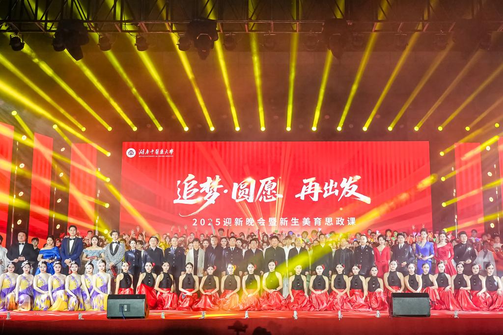 九十一载薪火相传,九十一季春华秋实。11月1日晚,湖南中医药大学2025年迎新晚会暨新生美育思政课精彩上演。省公安厅副厅长车丽华,省委教育工委委员、省教育厅党组成员余伟良,团省委二级巡视员邓资益,中国人民银行湖南省分行副行长谢汉阳,省通信管理局副局长王大顺,省戒毒管理局副局长黄勇,省公安厅刑事侦查总队政委陈东明,省公安厅禁毒总队政委易勇,省委网信办相关负责人等嘉宾,与湖南中医药大学党委书记戴爱国,校长易刚强,党委副书记汤文胜,副校长张玉芬、廖菁、刘红华出席晚会,驻长47所高校相关负责人、全省公安系统民警代表、学校教师代表及新生代表共计4500余人现场观看演出,超5万人通过全媒体平台观看晚会直播,共赴青春之约。