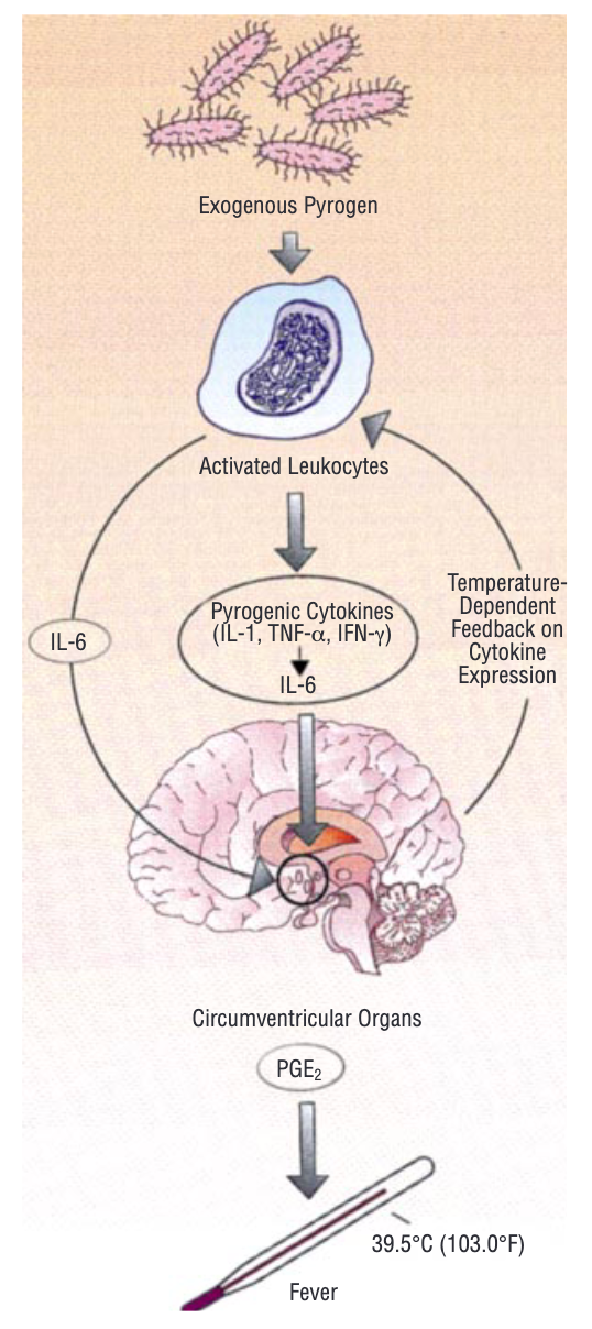 另外,有一些炎症介质会进入血液循环,作用于大脑的体温调节中枢,从而导致发热,这种现象在低龄的婴幼儿身上更为明显,因为他们的免疫系统和体温调节中枢都还不成熟,对感染的“反应”更大。