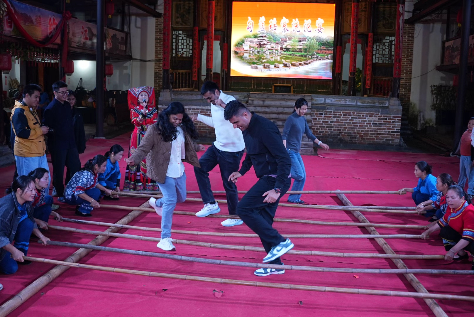 活动尾声,富有浓郁瑶族风情的洗泥宴热闹开启。原生态瑶族歌舞轮番上演,外国专家们主动加入竹竿舞互动,与当地群众手拉手踩着节奏跳跃。