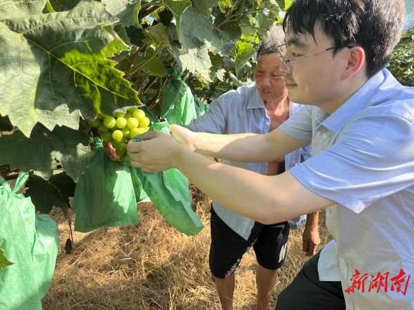 农行湖南常德分行客户经理查看农户葡萄丰收情况。