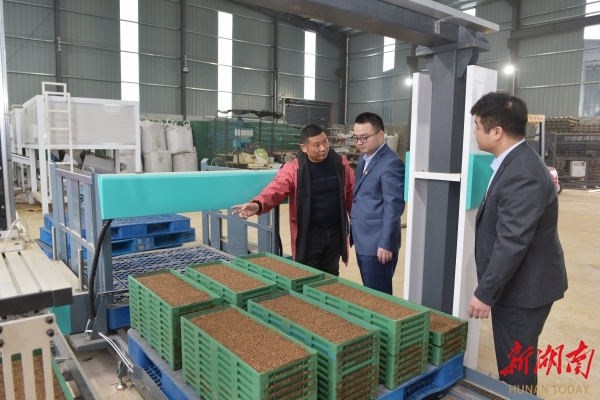 朝阳种植专业合作社负责人曹勇向农行岳阳屈原支行客户经理介绍育秧工厂的运行过程。