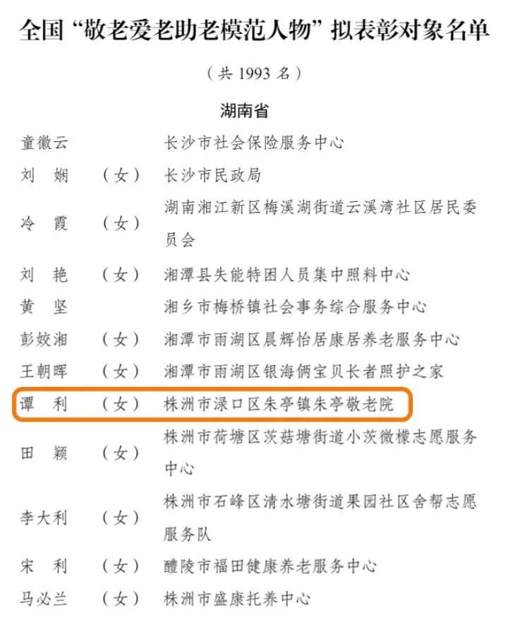 10月29日,全国老龄工作委员会办公室正式公布全国“敬老文明号”和“敬老爱老助老模范人物”名单,渌口区朱亭镇朱亭敬老院院长谭利荣获全国“敬老爱老助老模范人物”称号。
