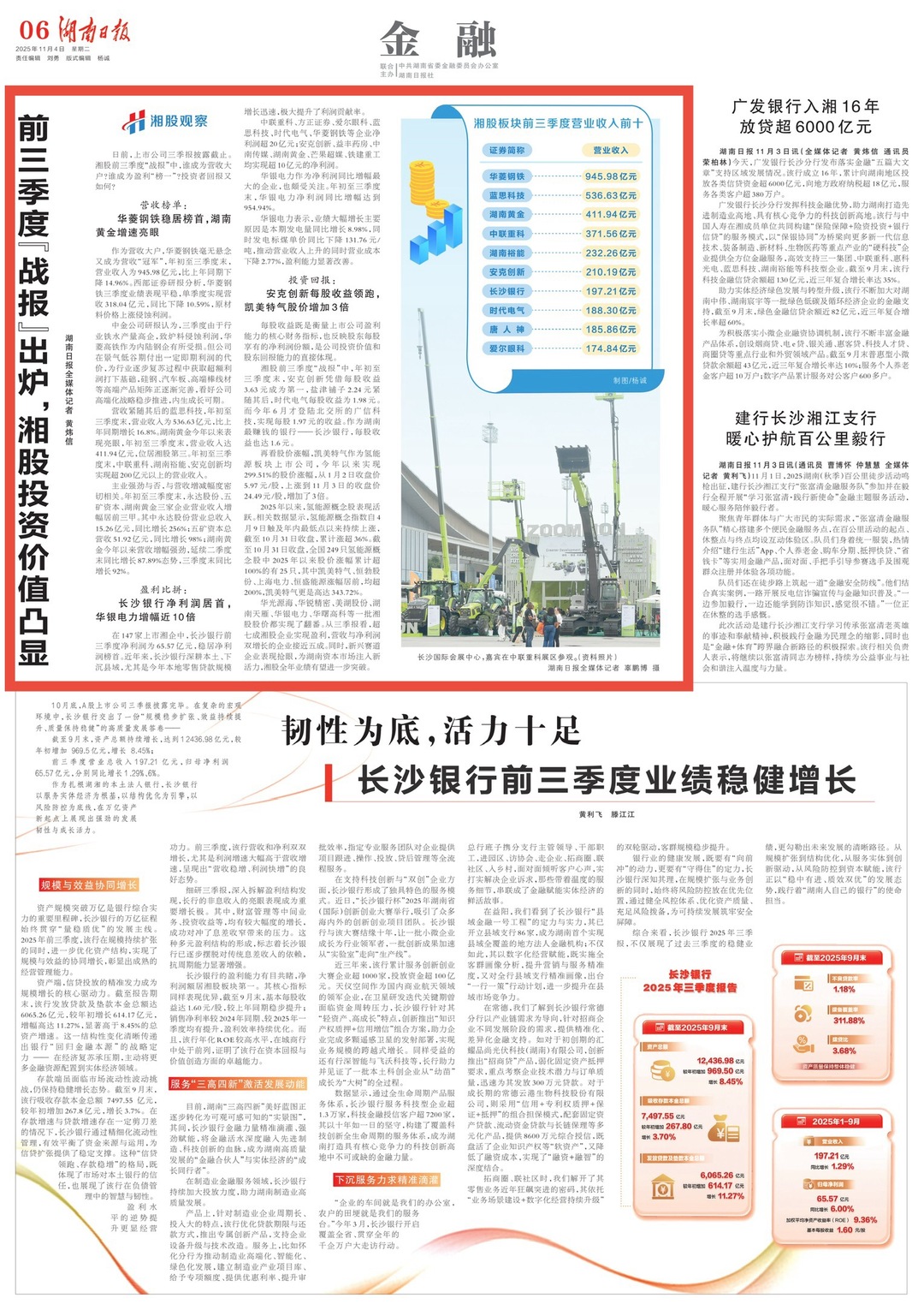 在147家上市湘企中,长沙银行前三季度净利润为65.57亿元,稳居净利润榜首。近年来,长沙银行深耕本土、下沉县域,尤其是今年本地零售贷款规模增长迅速,极大提升了利润贡献率。