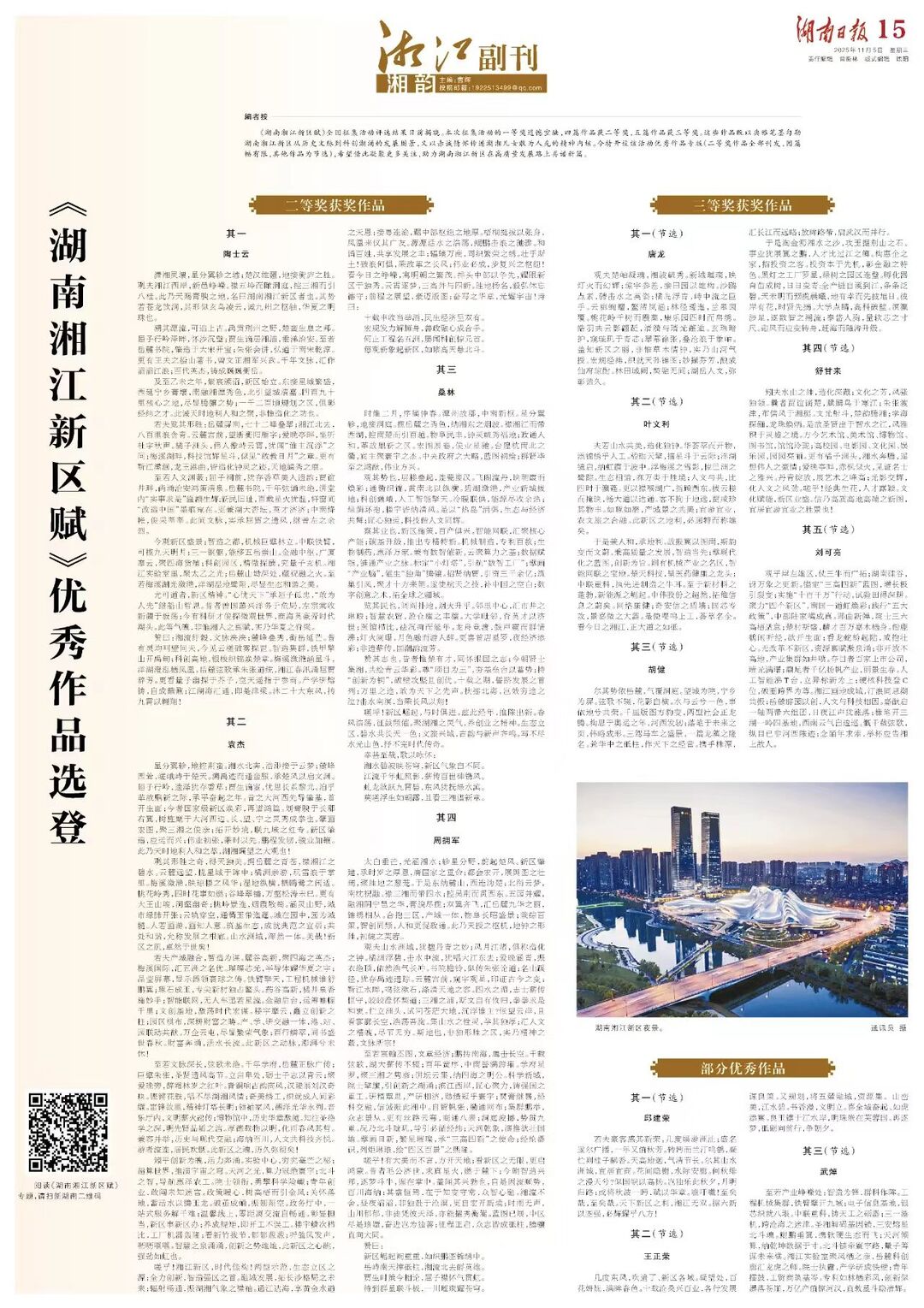 《湖南湘江新区赋》全国征集活动评选结果日前揭晓。本次征集活动的一等奖遗憾空缺,四篇作品获二等奖,五篇作品获三等奖。这些作品既以典雅笔墨勾勒湖南湘江新区从历史文脉到科创潮涌的发展图景,又以赤诚情怀传递湖湘儿女敢为人先的精神内核。今特开设该活动优秀作品专版(二等奖作品全部刊发,因篇幅有限,其他作品为节选),希望借此凝聚更多关注,助力湖南湘江新区在高质量发展路上再谱新篇。