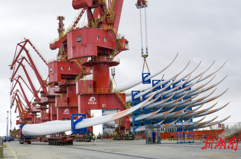 株洲时代新材料科技股份有限公司的风电叶片产品在射阳港装船,即将发往海外。