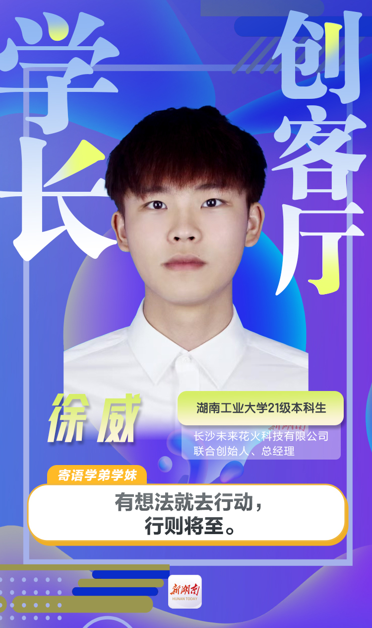 徐威,湖南工业大学21级本科生,曾在”作业帮”教育科技(北京)有限公司 、数字马力(长沙)信息技术有限公司,担任后端开发实习工程师,大学四年积累了丰富的实习经验。现任长沙未来花火科技有限公司联合创始人、总经理。企业于2025年3月首批入驻湖南工业大学孵化园并获得2025年株洲市高新区大学生创新创业第一期资金扶持。